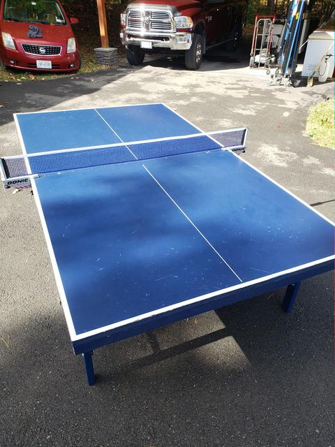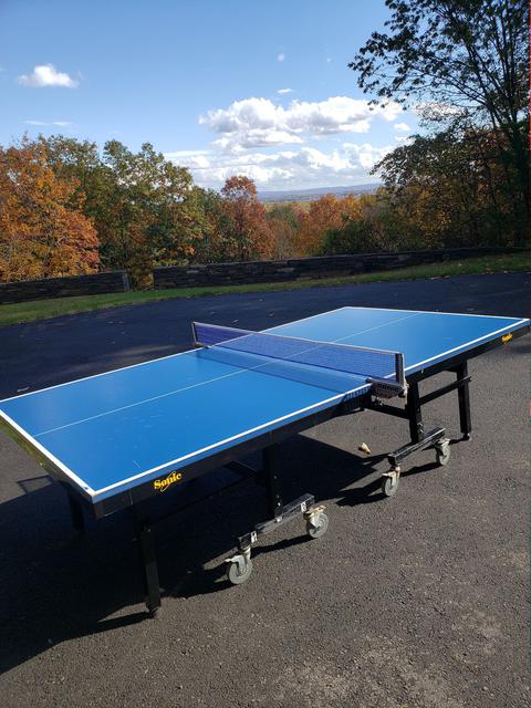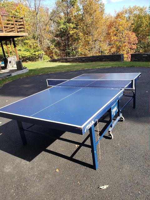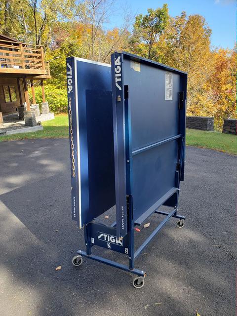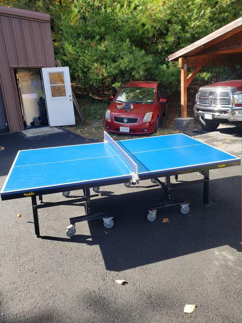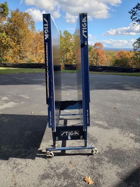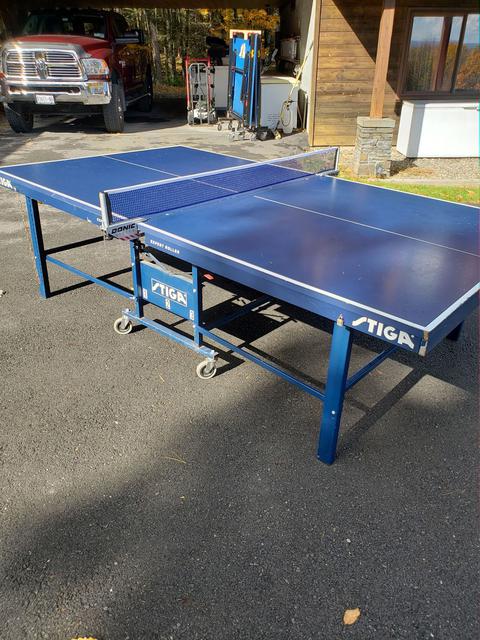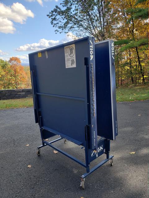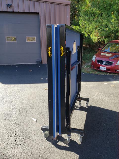 We have several used tables for sale. They have the expected wear and tear, but all are in very playable condition, structurally sound, and will come with a professional grade net set ($70 new - click to view), as well as at least 50 brand new Butterfly training balls. These are heavy duty, industrial pro-quality ITTF approved units with full 1" playing surfaces that will not warp. Available are two Stiga Expert Rollers (single fold design), as well as one Sonic (split design). The Sonic is actually a rebranded DHS table. For those not versed in the difference, a single fold design simply means the table is one large single rolling unit. Pros - makes folding it up or down a bit quicker, and it is extremely stable. Cons - takes up a bit more space when in a storage (folded) position, and is heavier overall than most split designs. A split design refers to tables where the two halves are independent from one another and can be rolled separately. Pros - Requires much less space to store. Cons - takes slightly longer to setup, as the two halves need to be aligned (but we're talking about a difference of perhaps a minute or less).